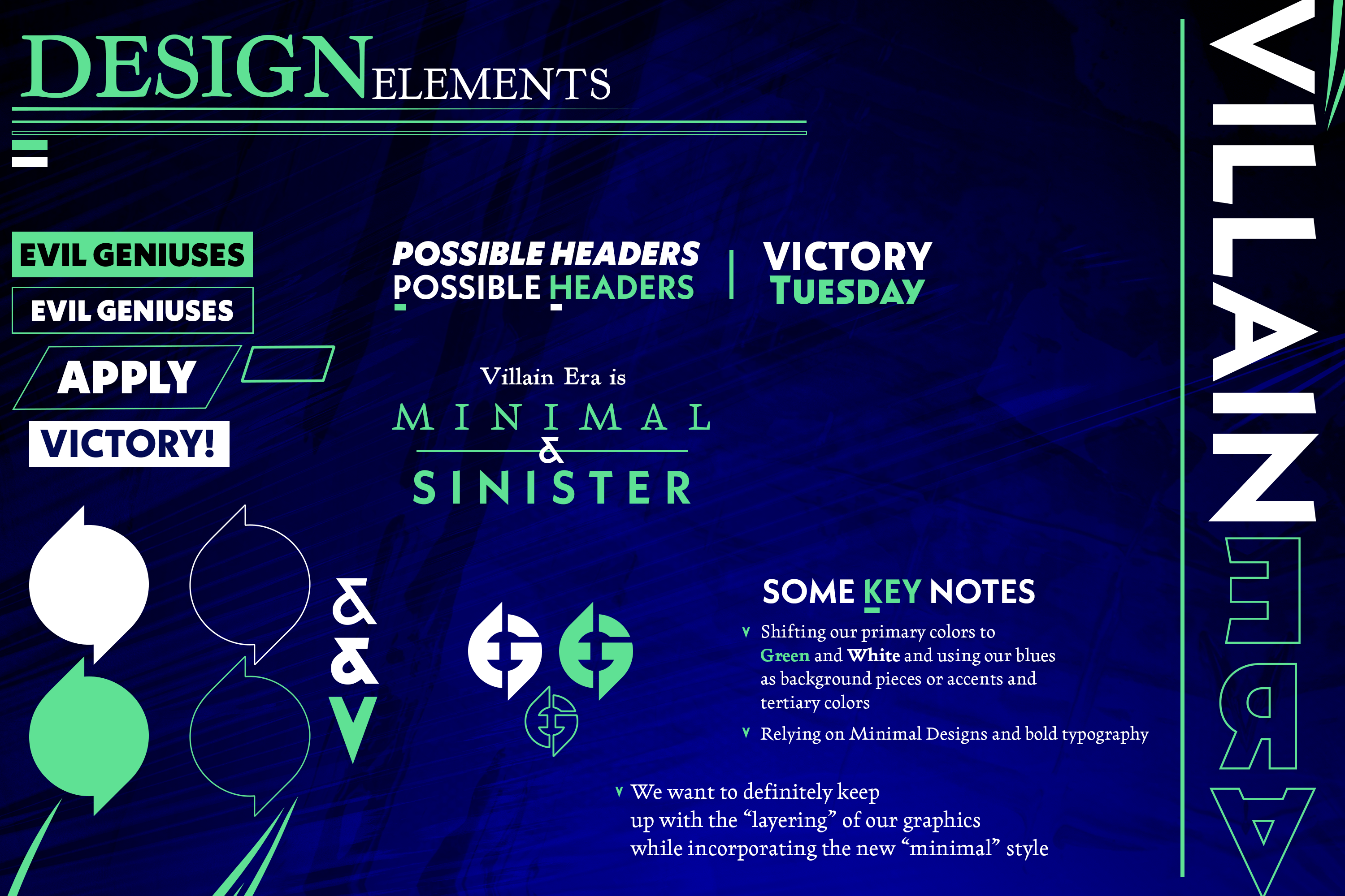 I led the art direction for Evil Geniuses' 25th-anniversary year brand refresh. This marked a significant cross-collaboration effort involving the C-suite, marketing department, sales, and gaming teams.